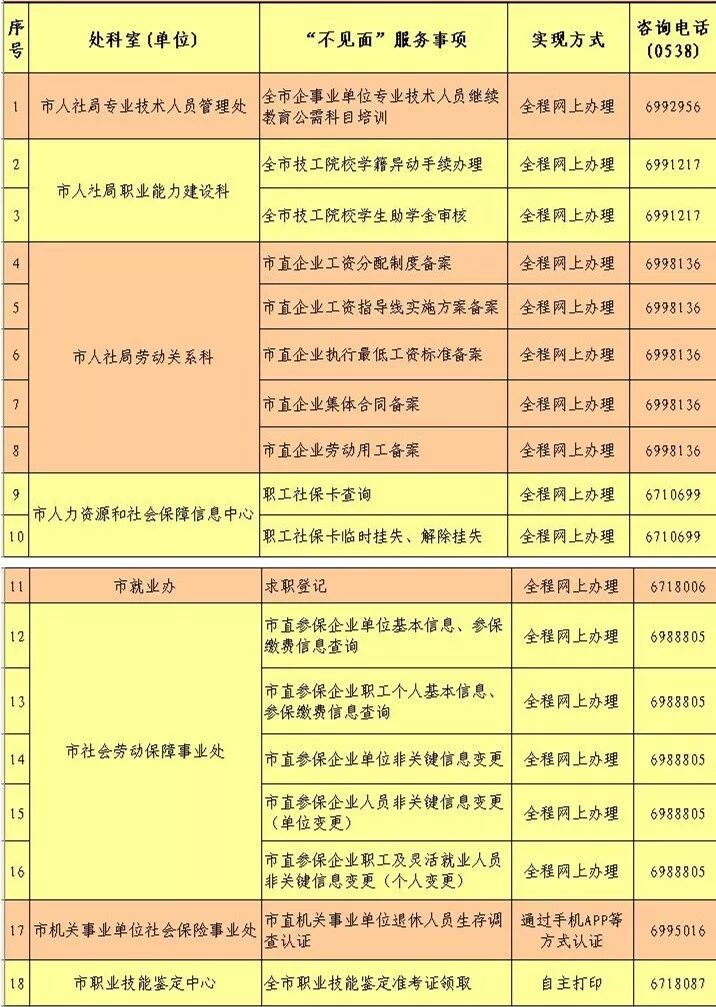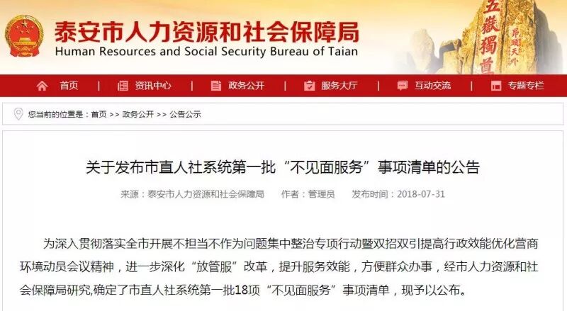 7月31日,泰安市人力资源和社会保障局在官方网站公布了市直人社系统第一批“不见面服务”事项清单。