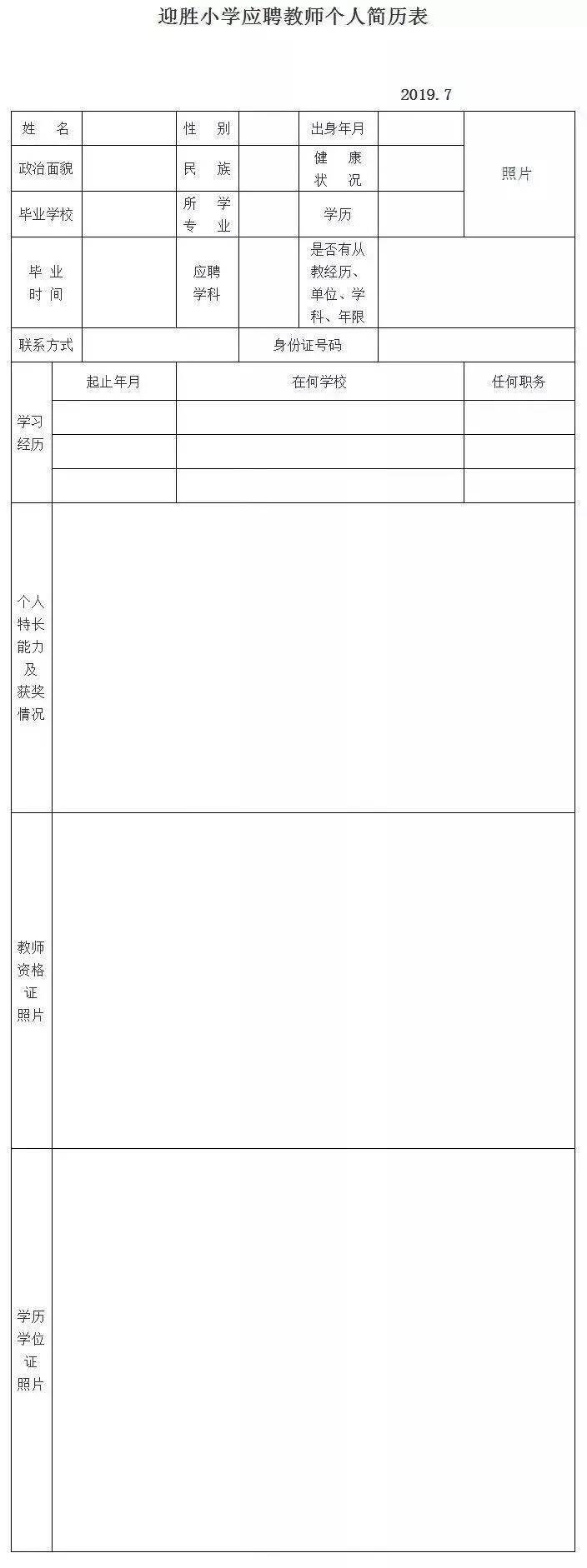 附:迎胜小学应聘教师个人简历表