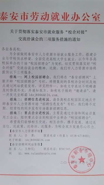 措施二:招聘信息进校园。请各高校在校园固定地点开辟泰安市人力资源市场“招聘信息发布”专栏,我们将不定期、经常性的同步发布市场最新招聘信息。