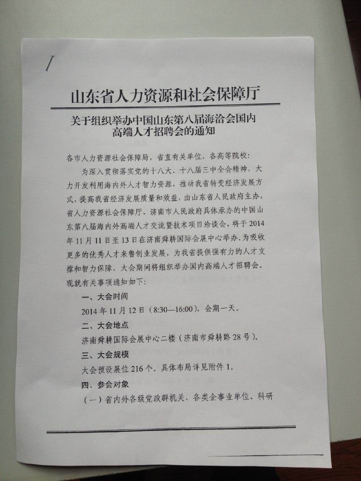 通 知 驻泰各用工单位: 如有参加2014年11月12日在济南舜耕国际会展中心举办的中国山东第八届海洽会国内高端人才招聘会的企业,